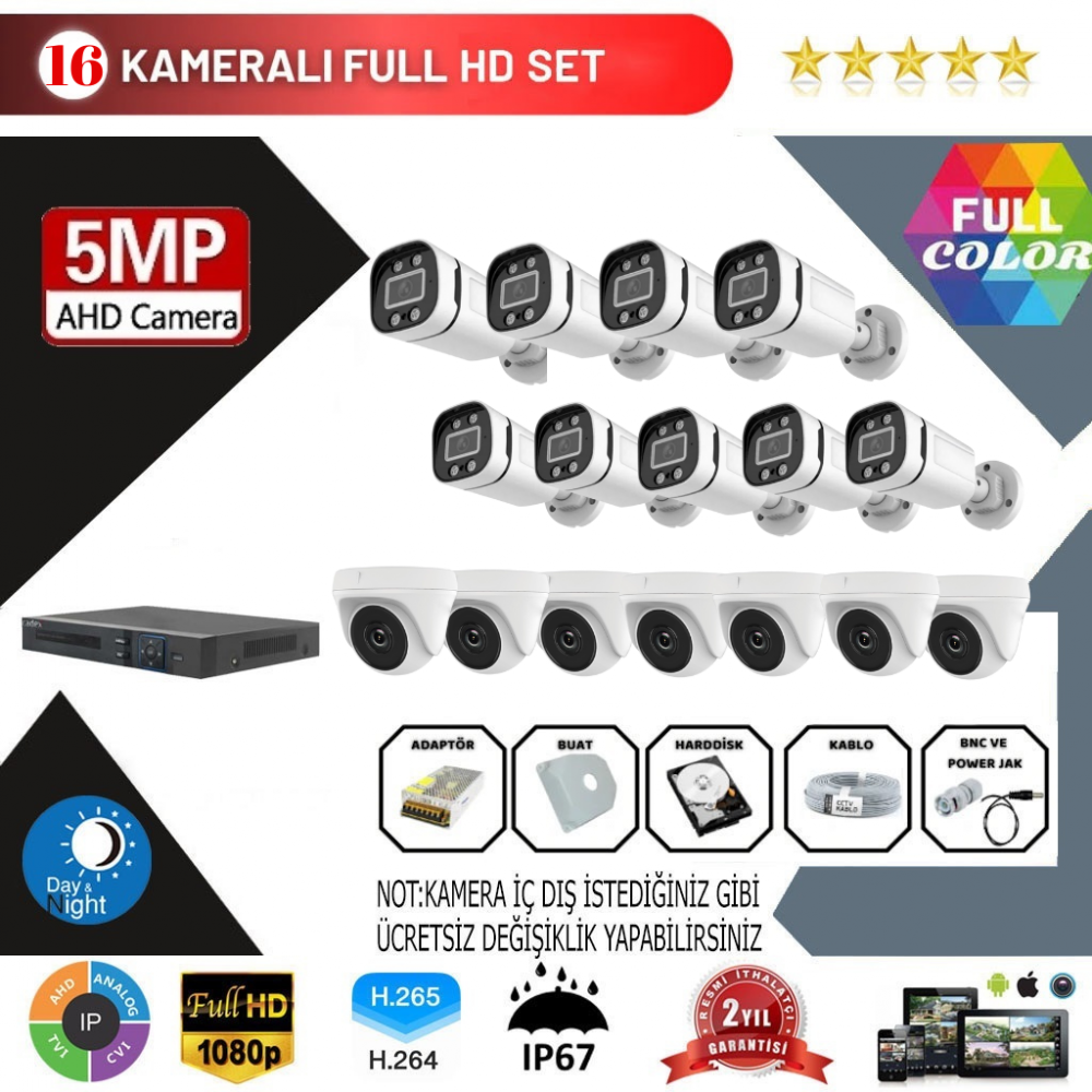 GOLD 16'Lı Kamera Seti 5MP Gece Görüşlü Full Color Serisi GE16-AHD-SET5mp