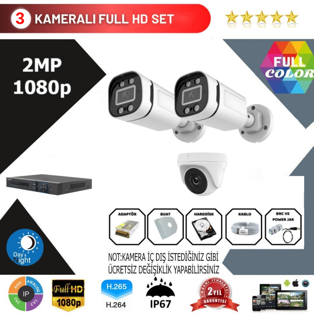 GOLD 3'Lü Kamera Seti 2MP Gece Görüşlü Full Color Serisi GE03-AHD-SET-2MP